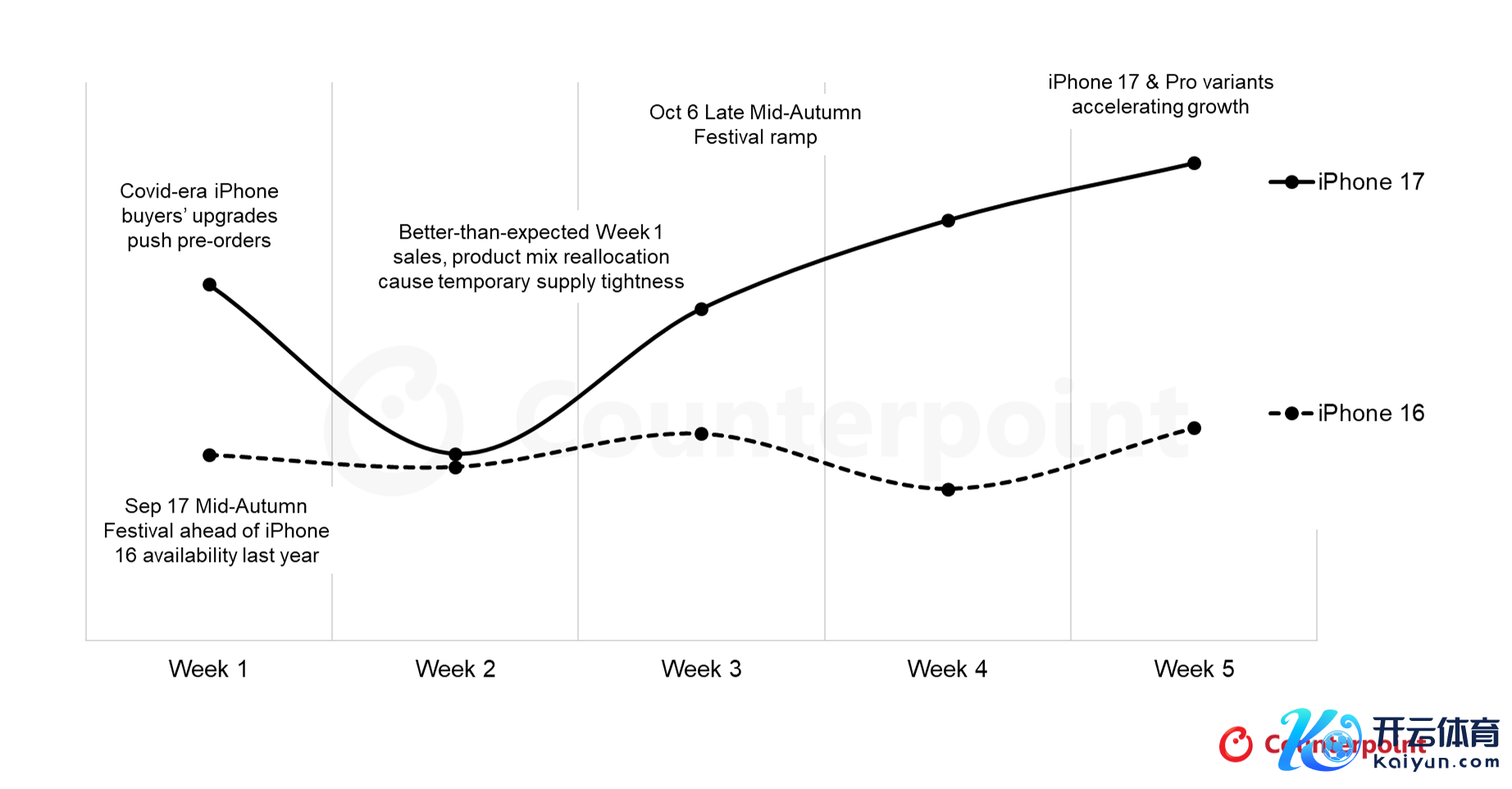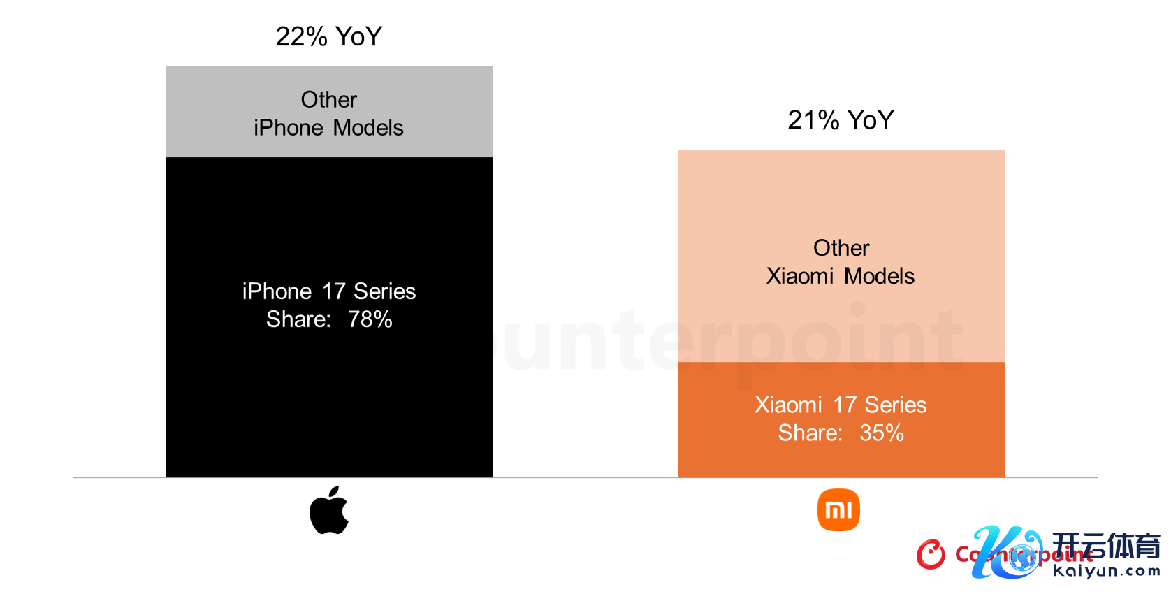 这不知名数据调研公司Counterpoint Research就绝顶针对iPhone 17系列、小米17系列首月在国内销量发扬进行了一个分析。他们合计iPhone 17系列、小米17系列商用首月发扬齐额外拉风,齐成为各自品牌在中国商场销量增长的核神思型。其中在iPhone 17系列开售的首月,同比举座销量增长22%,小米也在小米17系列首销的首月同比举座增长21%。且流露还特等强调这照旧苹果、小米在蓝本基础齐相比大的前提之下结束的,不错讲无论是iPhone 17系列照旧小米17系列齐大得到奏凯。