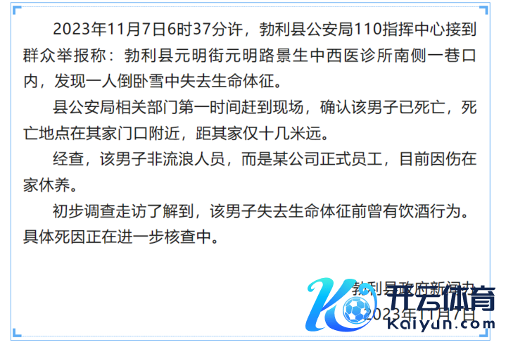 荔枝新闻讯 11月7日,有网民发视频称黑龙江省七台河市勃利县一须眉疑似酒后睡着,冻死街头。勃利县政府对此发布情况通报称,2023年11月7日6时37分许,勃利县公安局110勾通中心接到专家举报称:勃利县元明街元明路景生中西医诊所南侧一巷口内,发现一东谈主倒卧雪中失去生命体征。