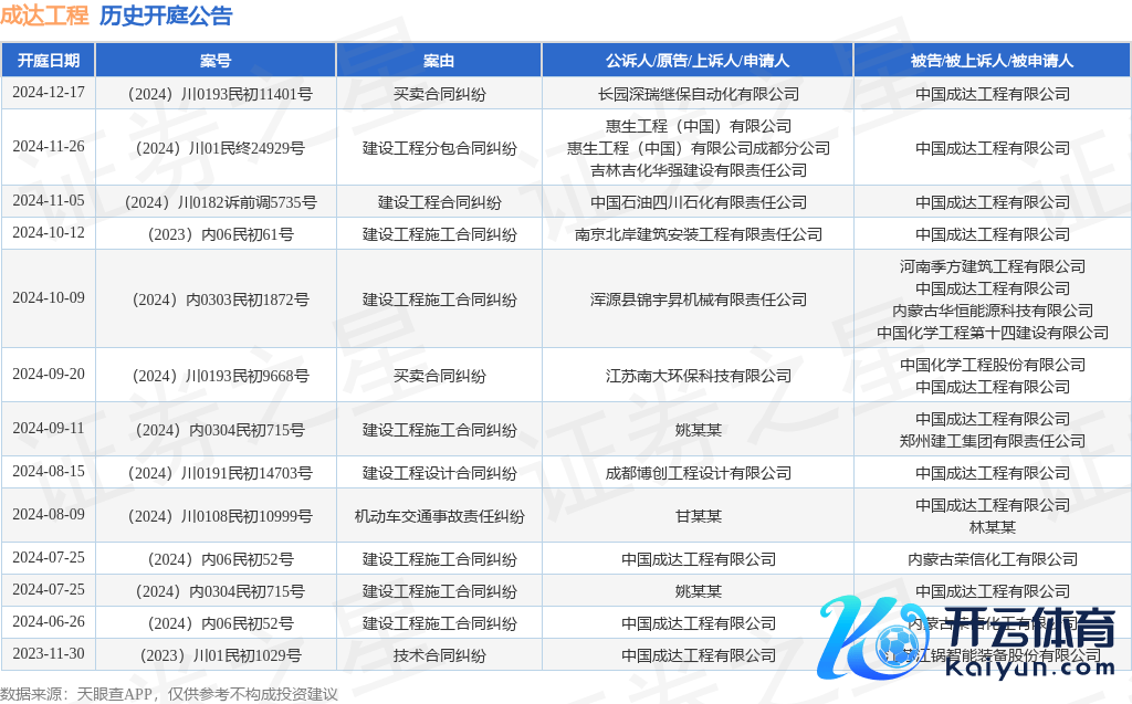 案号:(2024)川01民终24929号审理法院:四川省成齐市中级东谈主民法院案由:确立工程分包协议纠纷当事东谈主信息: 原告/上诉东谈主:惠生工程(中国)有限公司、惠生工程(中国)有限公司成齐分公司、吉林吉化华强确立有限职守公司 被告/被上诉东谈主:中国成达工程有限公司开庭日历:2024年11月26日凭据统计,近一年内以中国成达工程有限公司为当事东谈主的历史开庭公告有13则,其中案由为“确立工程施工协议纠纷”的公告以6则居首,其次为“贸易协议纠纷”有2则,“确立工程分包协议纠纷”有1则。历史开庭公告如下: