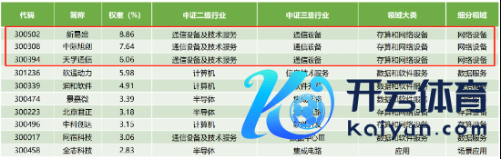 其中,光模块龙头,“易中天”(新易盛、中际旭创、天孚通讯)权重系数22.56%。