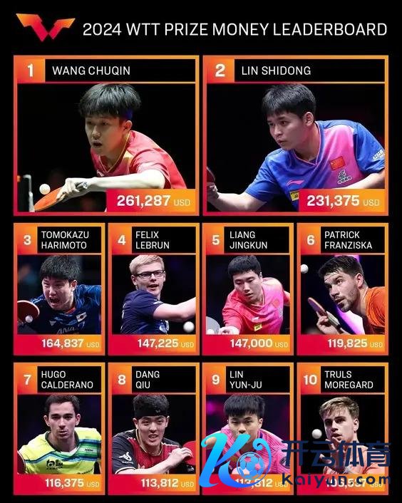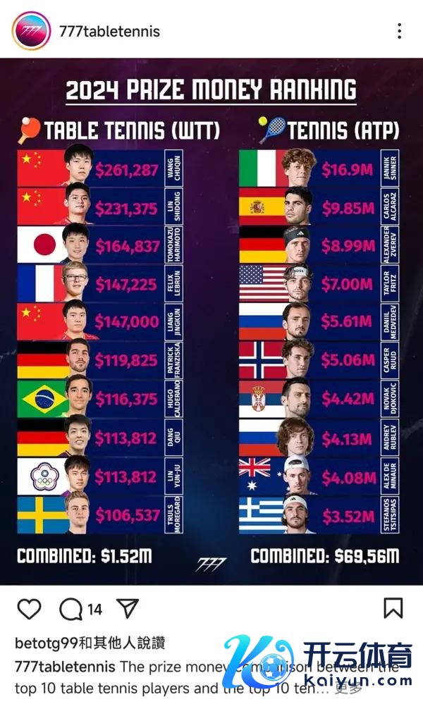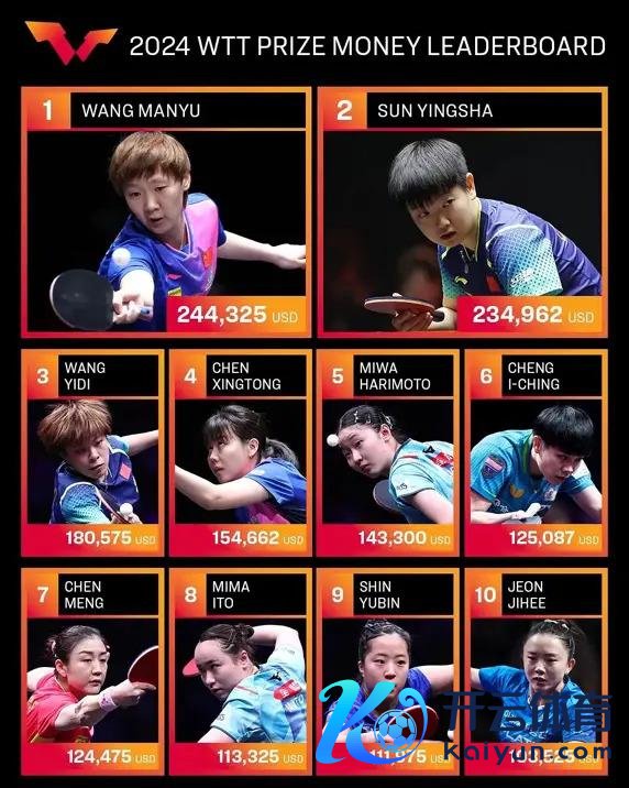 与高额的退赛代价酿成知道对照的是便宜的赛事奖金。不少东谈主也许看过 2024 年 WTT 发布的男女选手赛事奖金榜,哪怕是现在的天下第一,奖金也未几,更别说名次往后的球员。而与此同期,天下名次前十的选手退赛一次就要交纳 5000 好意思元的罚金,简直令东谈主难受。