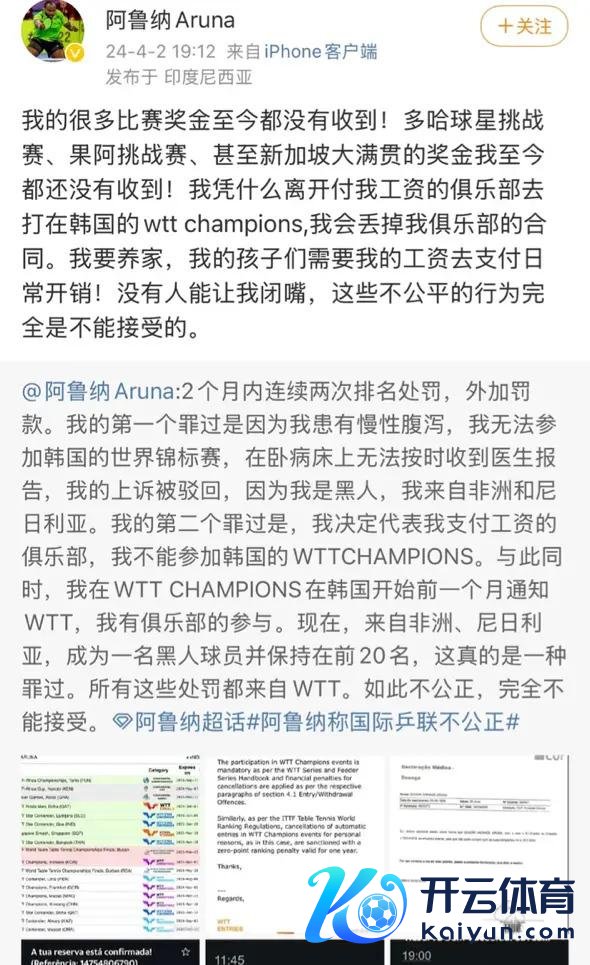 非洲选手阿鲁纳更是平直向 WTT 开炮,控诉被拖欠的奖金、分袂理的罚金、被影响的工资收入。