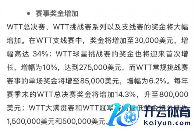 尽管在"首要更新"中,WTT 提到了加多赛事奖金,但仔细一看其实并没加多若干,反而看成最高赛事的大满贯上限变成 150 万好意思元,相较于 2024 年还是举办的中国大满贯和沙特大满贯的 200 万好意思元,反倒缩水了。