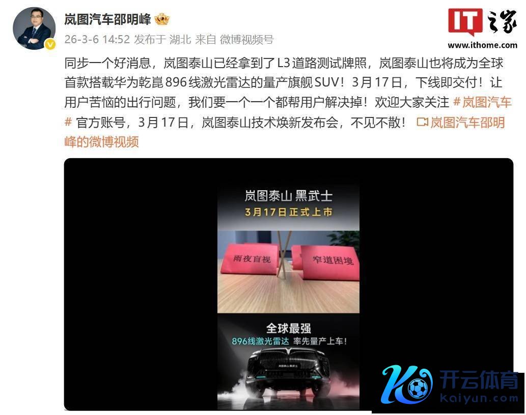 岚图汽车CBO、销售公司总司理邵明峰近日涌现,岚图泰山已奏效赢得L3说念路测试派司,并将成为民众首款搭载华为乾崑896线激光雷达的量产旗舰SUV。这一讯息无疑为行将到来的发布会增添了更多期待。邵明峰还暗示,3月17日,这款新车将罢了下线即委派,为糜掷者带来前所未有的智能驾驶体验。