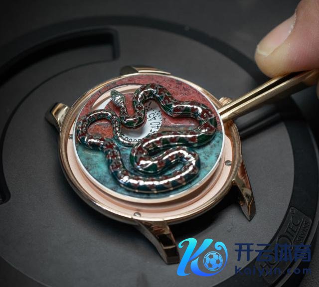 纯金打造的蛇身,由五个部分雕琢组合而成,上头点缀着雅克德罗互助多年的《指环王》演义插图创作家约翰·豪筹画的"如意"图案,带有吉利如意的好寓意。在如斯立体动听、袭击漂泊的名义上添加搪瓷工艺,确切是不现实的事,雅克德罗却挑战了不行能,在圆柱形的蛇身上烧制出浑然自成的渐变色搪瓷,制作工艺难度极高。