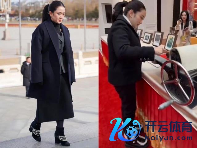 另一套深色大衣和西装看似低调,脚上的香奈儿珍珠靴和Jimmy Choo雪地靴照旧涌现了名媛身份。