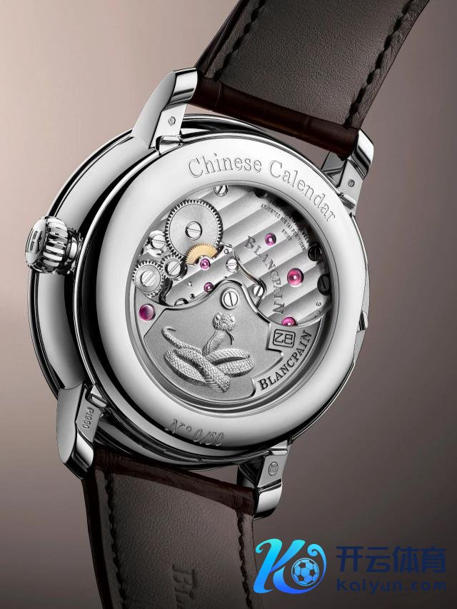 后面金质摆陀上头,可以看到手工锦上添花的立体蛇形浮雕,由艺术专家职责室全心打造,摆陀上还镶嵌一颗自然红对持,并刻有"乙巳"两字,象征着每一天王人"蛇来运转"。