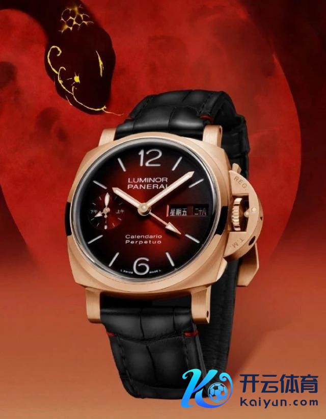 沛纳海的新春末端新表亦然年味十足,这枚全新Luminor庐米诺系列44毫米自动上链万年历两地时红金手表PAM1688,专利Goldtech™红金表壳搭配红色太阳辐射纹表盘,重叠交运,数字"88"自带好寓意,华文日期星期自大亦然相配别致。