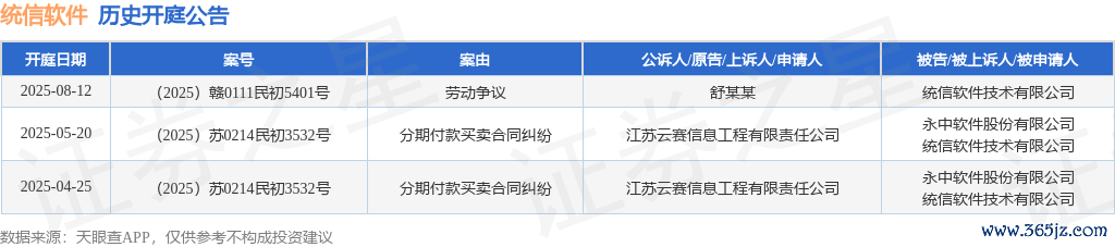 案号:(2025)赣0111民初5401号审理法院:南昌市青山湖区东说念主民法院案由:职业争议当事东说念主信息: 原告/上诉东说念主:舒某某 被告/被上诉东说念主:统信软件期间有限公司开庭日历:2025年8月12日凭据统计,近一年内以统信软件期间有限公司为当事东说念主的历史开庭公告有3则,其中案由为“分期付款交易协议纠纷”的公告以2则居首,其次为“职业争议”有1则。历史开庭公告如下: